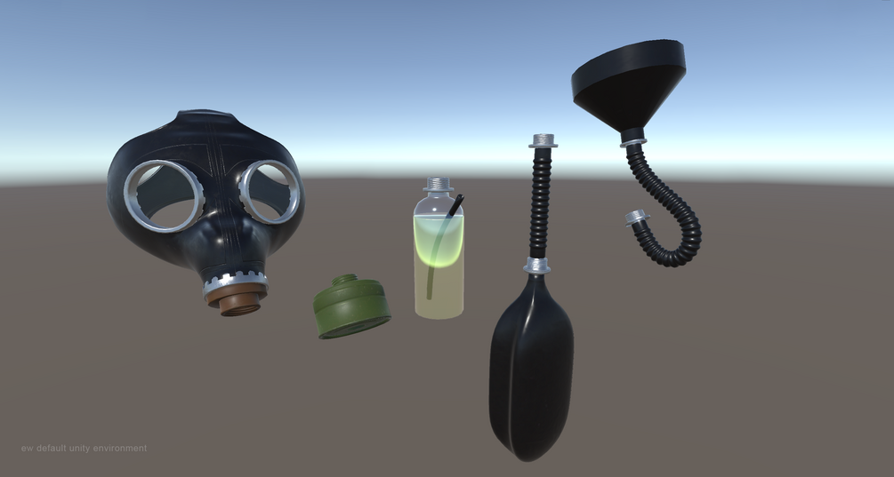 The prefab comes with a handy dandy little menu to toggle the gas mask, a toggle for the filter, a toggle for the air bag rebreather (that even uses the nardos breathing animation!), a toggle for the flavour inhaler bottle (bottle and bag are pre-set up on hose 1), a material swap to black out the lenses, a radial wheel material swap for the 7 different textures, and a wheel to pick between the 4 different sized hoses